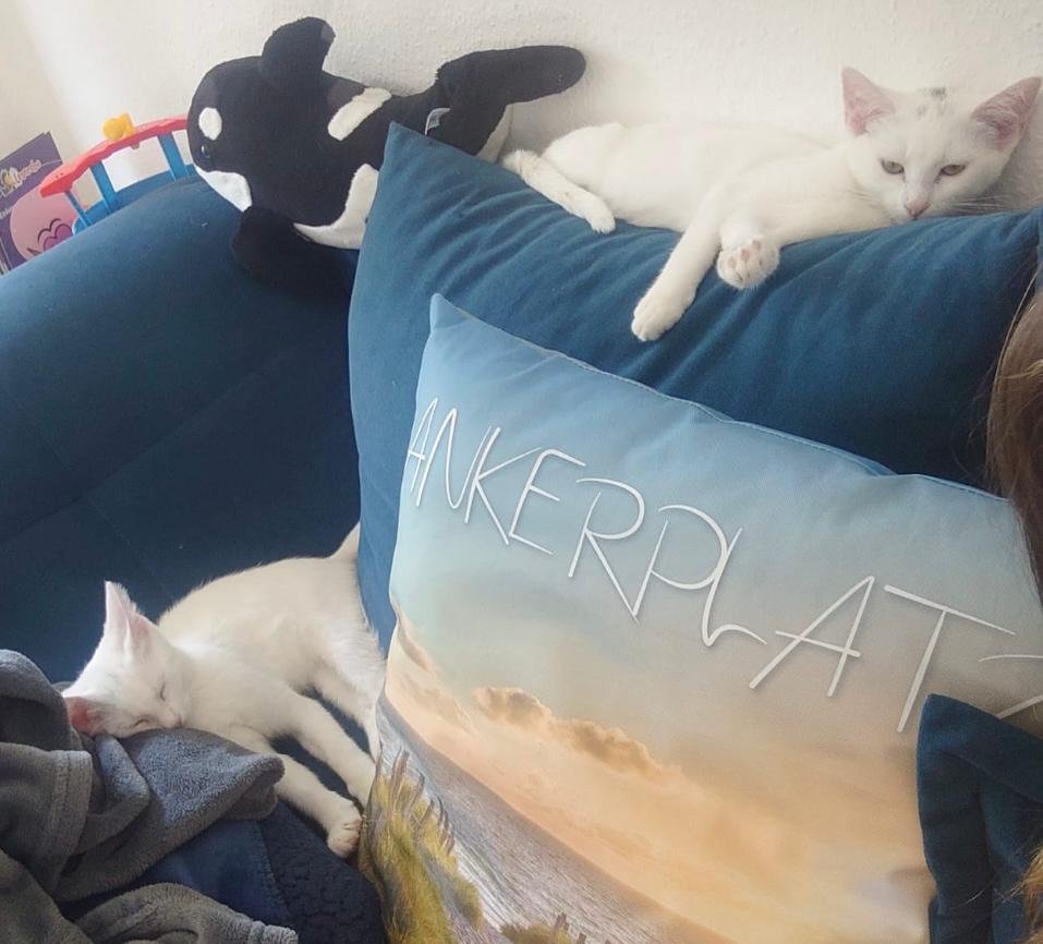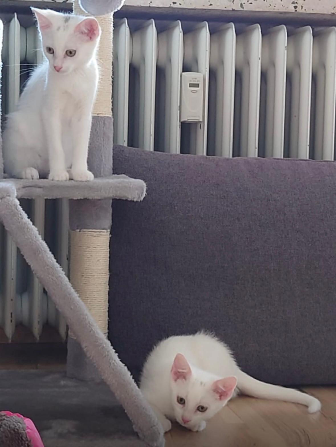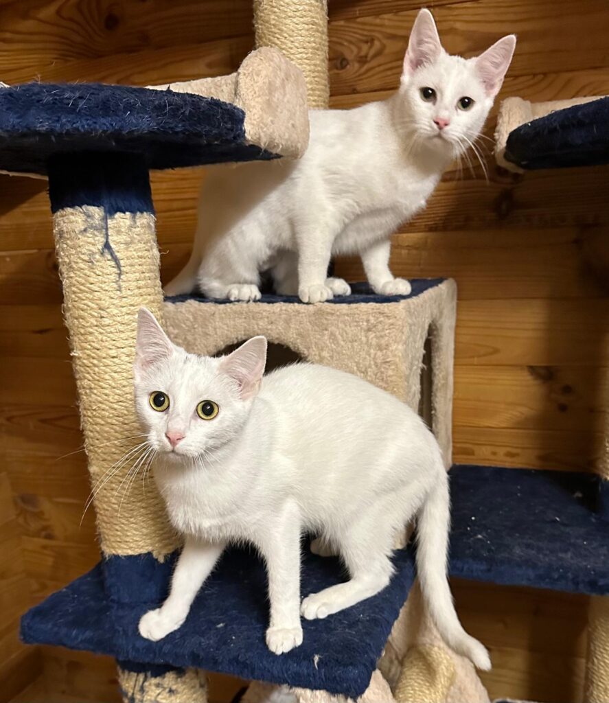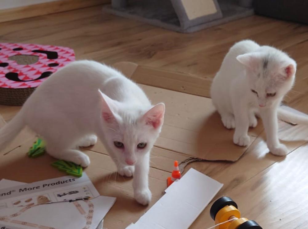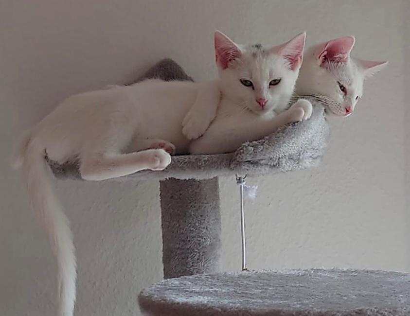 Diese beiden weißen Katzendamen suchen gemeinsam ein liebevolles Zuhause in Wohnungshaltung. Beide sind weder blind noch taub. Sie wurden im Rahmen einer Kastrationsaktion gesichert und von Tierschützern aufgenommen. Über unseren Verein kamen sie schließlich in die Vermittlung.