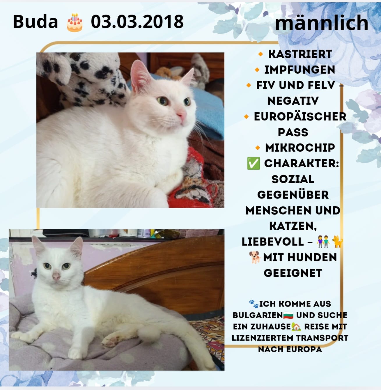 Angel ist eine wunderschöne weiße Katze, die ursprünglich von der Straße stammt – doch sie hat sich als eine besonders zutrauliche und liebevolle Begleiterin entpuppt. Ursprünglich sollte sie nur kastriert werden, doch ihre freundliche und sanftmütige Art hat uns sofort begeistert.