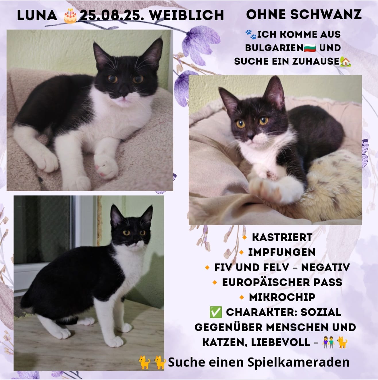 Leona ist geimpft, gechipt und auf FIV/FELV negativ getestet. Aufgrund ihres Alters ist sie noch nicht kastriert, dies wird voraussichtlich Mitte bis Ende März 2026 nachgeholt. Wenn Sie dieser charmanten Katze ein liebevolles Zuhause geben möchten, freuen wir uns auf Ihre Anfrage!