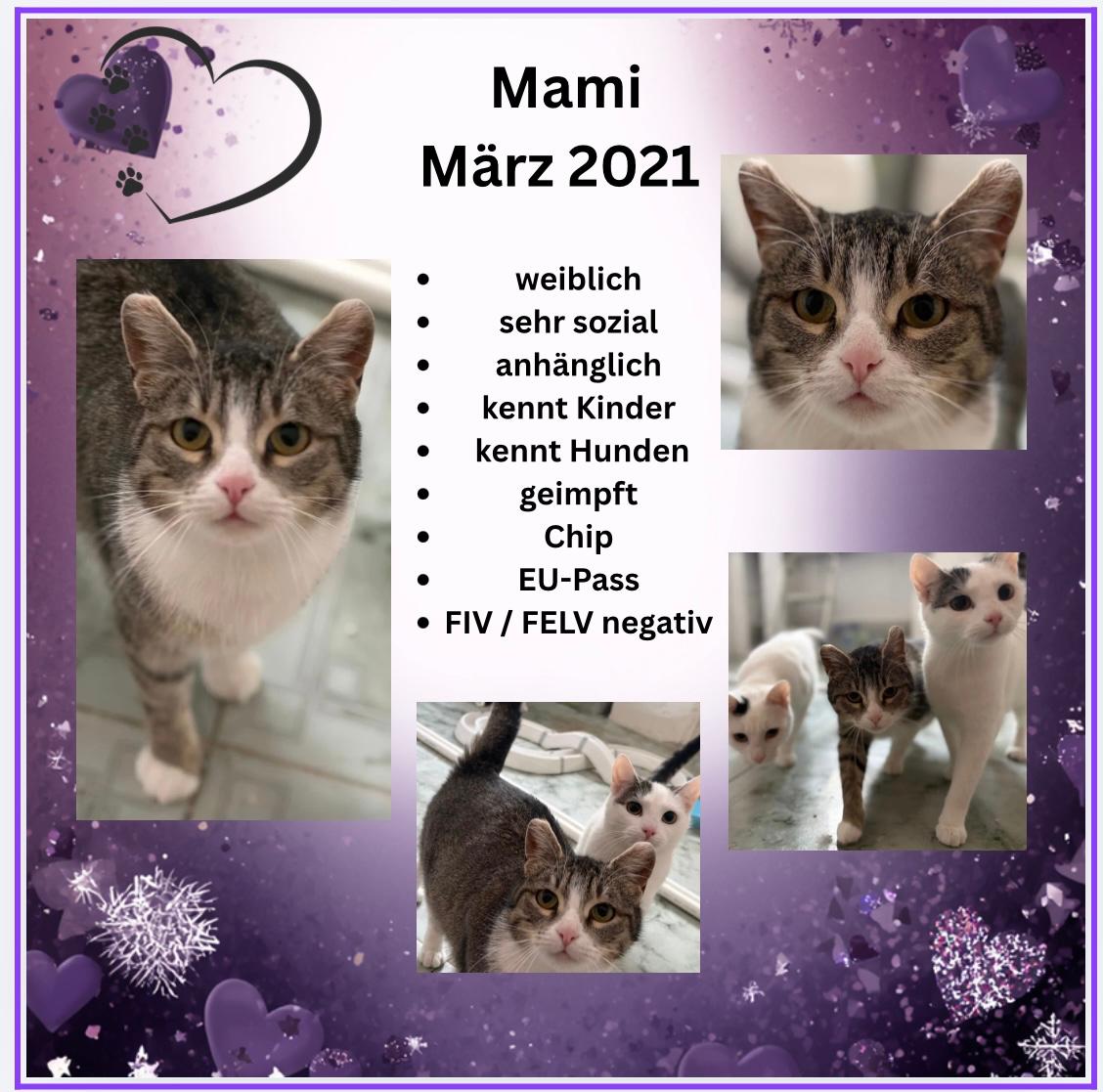 Mama ist eine fürsorgliche und liebevolle Katzenmama, die bei unserer Tierschützerin in Rumänien abgegeben wurde. Dort brachte sie ihre beiden Kitten zur Welt und kümmerte sich vorbildlich um sie. Sie ist menschenbezogen, sehr anschmiegsam und genießt jede Streicheleinheit. Mama ist gesund, sozial und hat keinerlei Probleme mit Alltagsgeräuschen, Kindern oder anderen Tieren. Auf ihrer Pflegestelle lebt sie in einer entspannten Umgebung und zeigt, wie sanft und liebevoll sie ist.