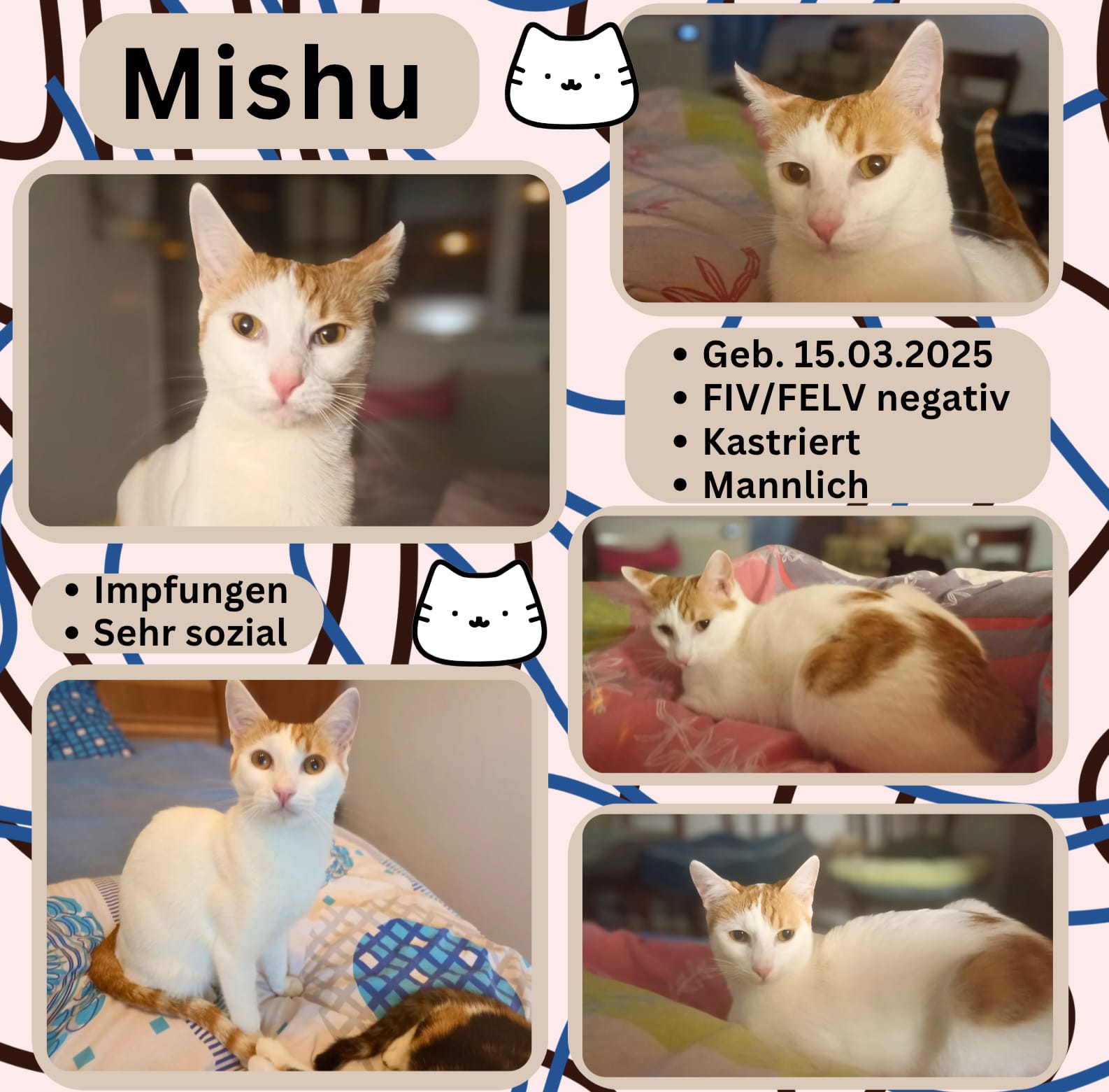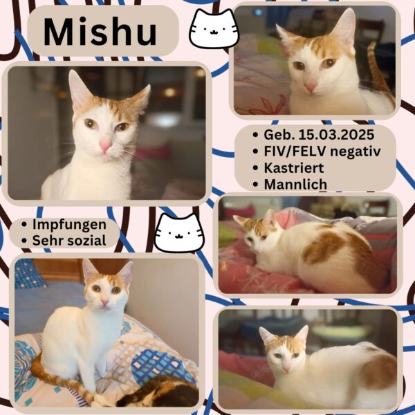 Aus dem verängstigten Findelkind entwickelte sich ein wunderschöner, intelligenter und sanfter Kater, der sich mit allen Katzen in seinem Umfeld bestens versteht. Mishu ist nun bereit, in ein liebevolles Zuhause zu ziehen, in dem er die Sicherheit und Geborgenheit findet, die er verdient.