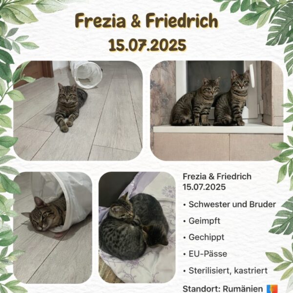 Frezia und Friedrich – zwei wunderschön getigerte Kätzchen, die gemeinsam auf der Straße ausgesetzt wurden, hungrig und ganz allein. In den ersten Wochen ihres Lebens mussten sie Schmerz und Angst erfahren. Doch ihre Geschichte nahm eine glückliche Wende: Sie wurden in Sicherheit gebracht, liebevoll gepflegt und umsorgt. Heute sind sie kaum wiederzuerkennen – aus den verängstigten Findelkindern sind zwei wundervolle, selbstbewusste Katzen geworden.