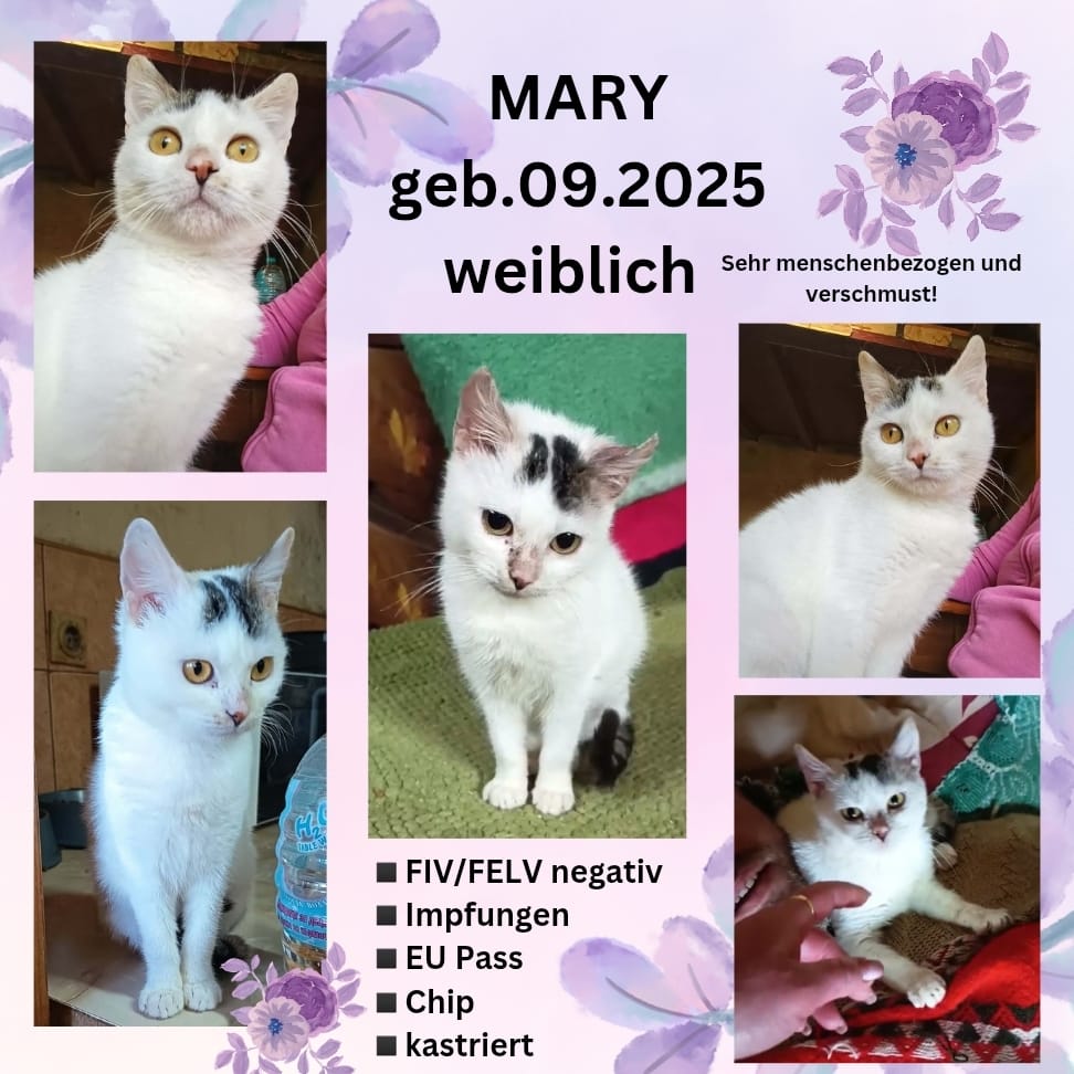 Aktuell lebt Mary im Privathaushalt unserer Tierschützerin, wo sie gemeinsam mit anderen Katzen unterschiedlichen Alters die Alltagsgeräusche kennenlernt. Sie ist auf dem besten Weg, sich zu sozialisieren, und es gibt keine Anzeichen, dass sie sich zu einer Einzelkatze entwickeln wird. Wir empfehlen daher die Vermittlung zu einem ruhigen, sozialen Kitten, das ihr Sicherheit gibt.