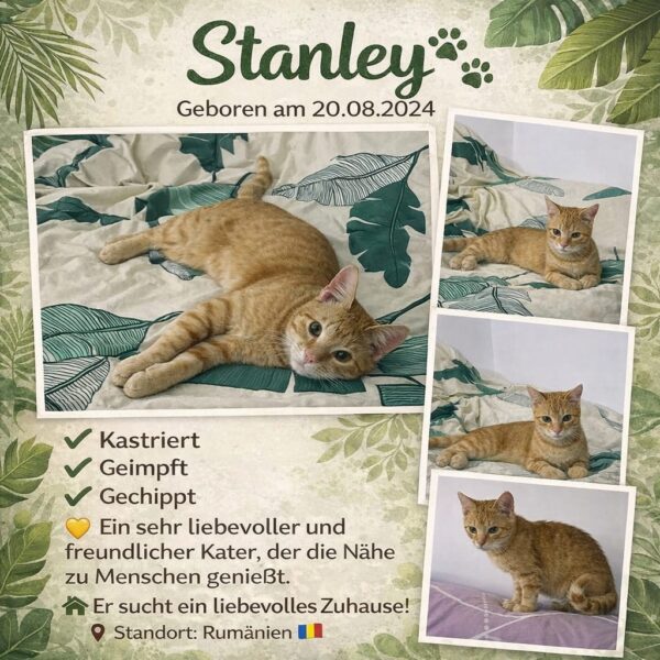 Stanley ist ein wunderschöner, orangefarbener Kater, der in einem Hof älterer Menschen aufgewachsen ist – umgeben von vielen anderen Katzen, aber ohne die Fürsorge, die er verdient hätte. Er war eine arme Seele, die nie genug Liebe oder Futter bekam. Einige seiner Artgenossen konnten bereits gerettet werden, und auch scheue Katzen wurden kastriert. Schritt für Schritt arbeiten wir daran, auch den anderen ein besseres Leben zu ermöglichen.